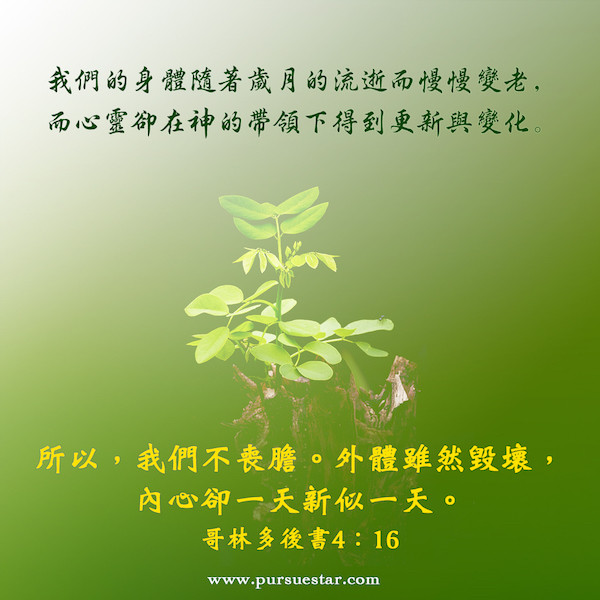 “所以我们不丧胆;外体虽然毁坏,内心却一天新似一天。我们这至暂至轻的苦楚,要为我们成就极重无比永远的荣耀。原来我们不是顾念所见的,乃是顾念所不见的;因为所见的是暂时的,所不见的是永远的。”(林后4:16-18)
