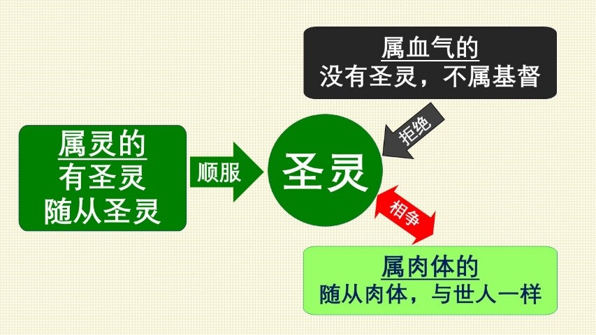 属血气的人,没有圣灵,不属基督。这种人是拒绝圣灵,抵挡圣灵,行不义抵挡真理的人。属肉体的人,是有圣灵的人,但是生命不追求成长,还在属肉体的状况,体贴旧人的本性,随从肉体的情欲,所行与世人一样,没有生命的见证。这种人的生命里有很多挣扎,因为肉体的情欲跟圣灵相争,但没有随从圣灵,还没有得胜的见证。这种基督徒需要彻底认罪悔改,追求属灵生命的成长。就如下面的图示。