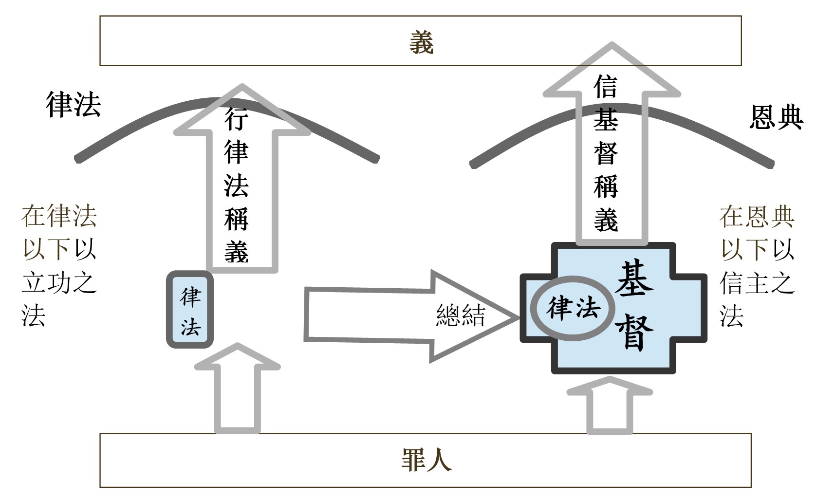 说的多好啊!原来,“律法的总结就是基督”,把律法与基督联结起来(画在上图自左至右的箭头):律法被包在基督十字架里面。这句话表明了四个神学观念之间的关系:信、义、基督、律法。在上图左边律法之下,以色列人因为不知道神的义,想要试图全守律法去立自己的义而得不着,所以“行律法称义”的箭头没有接触到 “义”。而在上图右边恩典之下,信主的外邦人反而得着了“义”,“信基督称义”的箭头进入了“义”。一节简洁的经文就把左边“律法之下”与右边“恩典之下”两个称义的架构统一了!
