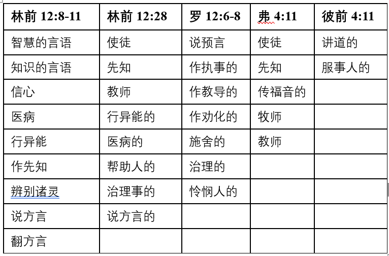 我们知道使徒保罗不是列出完全的恩赐清单,而是有选择的。在清单里有些是讲恩赐的类型,有些是讲恩赐的职分。哥林多前书十二章28节和以弗所书4:11就是讲职分或者有这些恩赐的人。