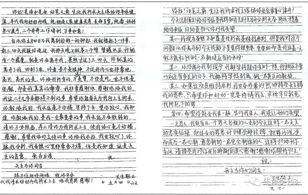 五、他晓得监狱当局特别注意我的一举一动,看守所长曾两次亲自提审我,数次召见同室犯友(看守所长提审犯人是很罕见的),调查我有无传福音的“反动言行”。为保护我,他央求别人把我写下的经文、祷词全部重抄一遍,以防我被发现后加刑。并自己竭力练习写字,以便有朝一日,能自己抄写经文;出现问题,自己承担责任,不累及我与他人。