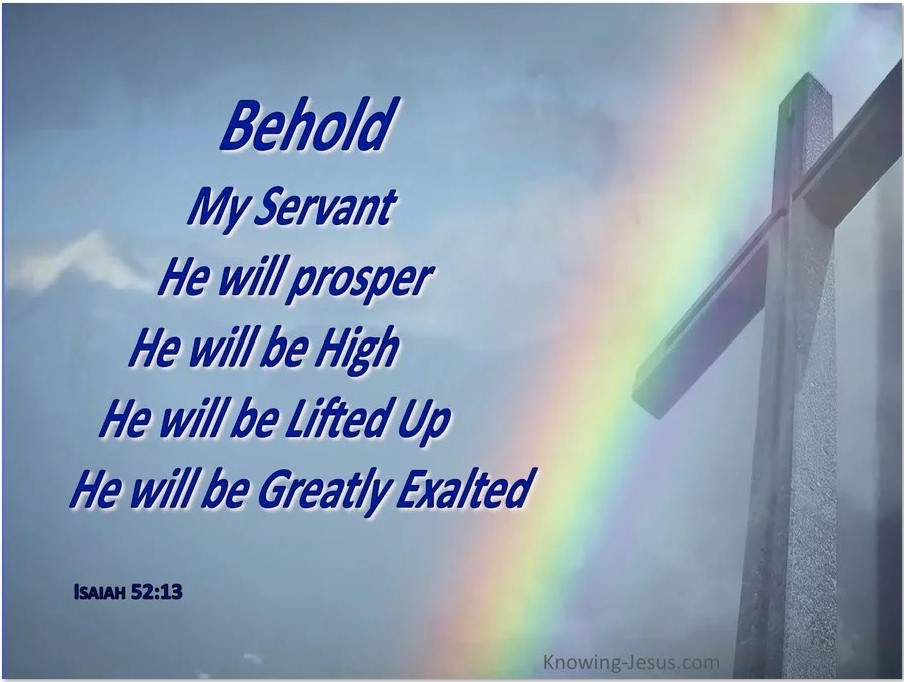 仆人必被高举上升且成为至高,是将形容耶和华神的位格完全等同的应用在仆人身上。仆人是谁,决定了祂要做什么和怎么做。祂要洗净许多国民;祂要担当世人的罪孽过犯;祂要被耶和华压伤;祂要像羊羔一样被牵到宰杀之地。那荣耀的“奇妙的策士、全能的神、永在的父、和平的君”,要经过受苦、被高举上升且成为至高。