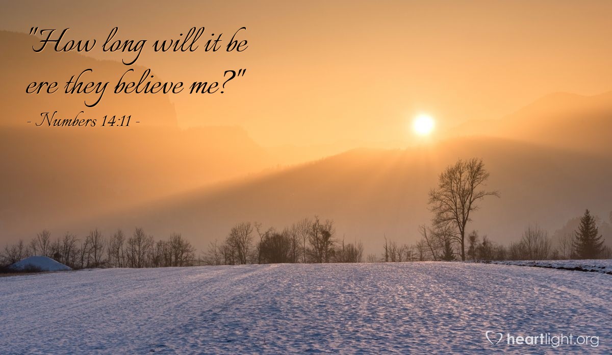 今日经文:“耶和华对摩西说,这百姓藐视我要到几时呢?我在他们中间行了这一切神迹,他们还不信我要到几时呢?我要用瘟疫击杀他们,使他们不能承受那地,叫你的后裔成为大国,比他们强盛。”(民14:11-12)