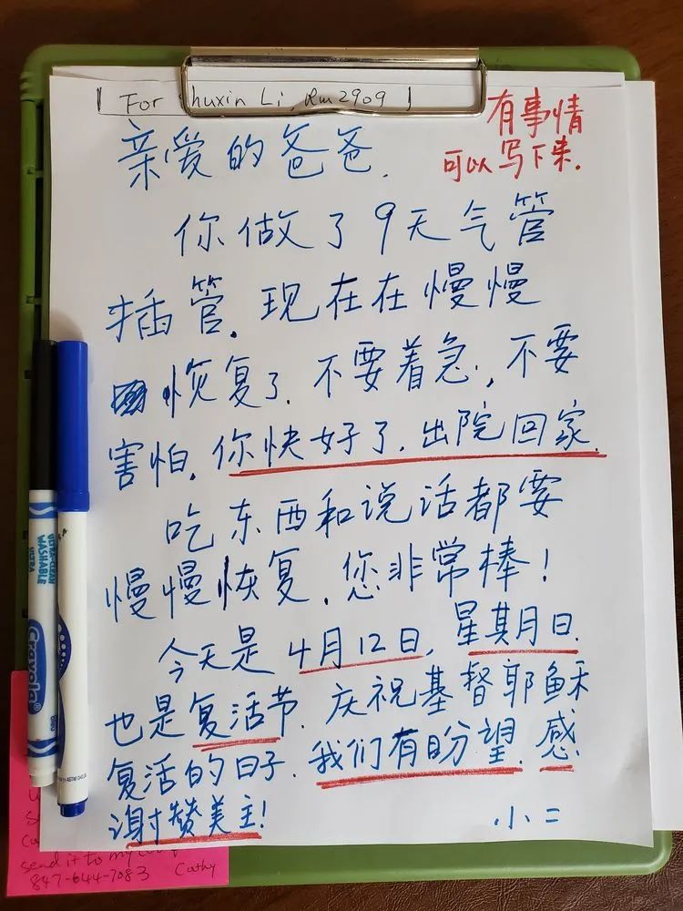 虽然还不能跟他见面或者电话交流,但是我想到他能看信! 我请护士拿来纸和笔,我写了一封很简单的信来鼓励他。字写得大大的,很容易看清楚。我请护士把信送给他看,知道爸爸看懂了信,也听到我说话了。这给我很大的安慰。