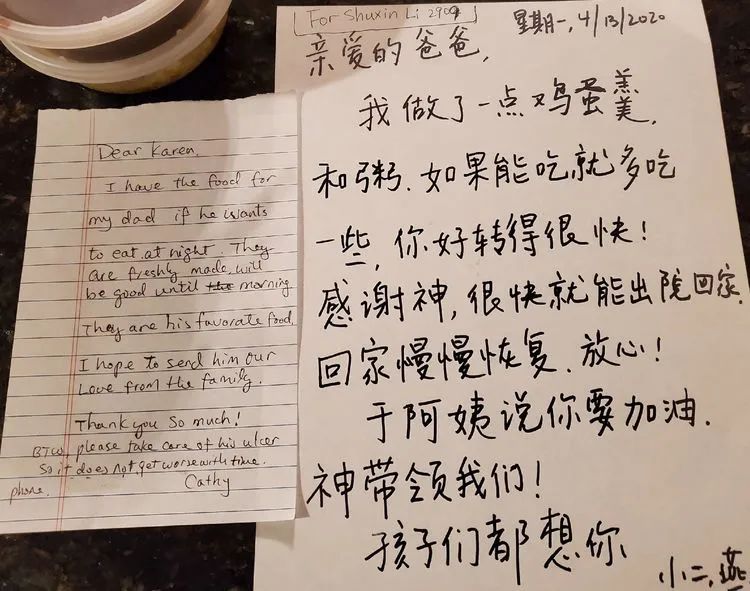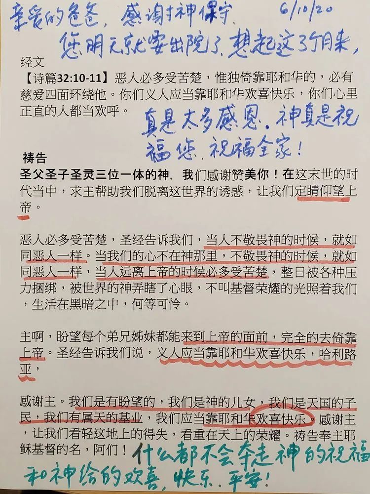 自从爸爸在医院里拔管清醒以后,我每天给爸爸写信。我很珍惜这个写信的过程,这样的交流是我能为他做的不多的事情之一。在信里我告诉爸爸日期、病情的进展、治疗方案等等。最重要的是我每天给爸爸写圣经的经文和祷告,用上帝的话语来鼓励他,告诉他我们爱他,神爱他,一定要坚持住。爸爸每天也非常期待我的信。