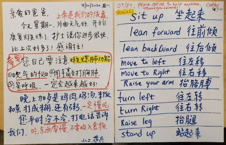 这是爸爸住进康复中心第一天的时候给他写的信,和一些基本用词的中英翻译对照。他可以指着中文,让护士护工看英文。