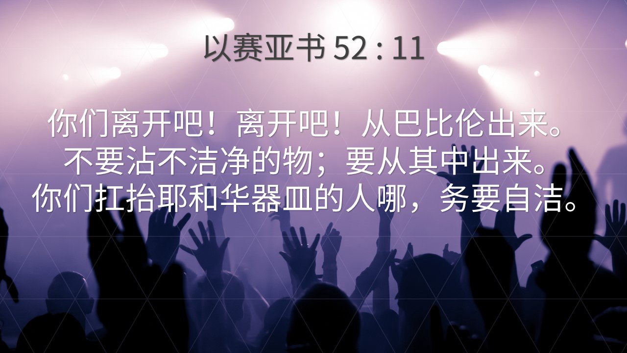 今日经文:你们离开吧!离开吧!从巴比伦出来,不要沾不洁净的物;要从其中出来。你们扛抬耶和华器皿的人哪,务要自洁!你们出来必不至急忙,也不至奔逃。因为耶和华必在你们前头行。以色列的神必作你们的后盾。(赛52:11-12)